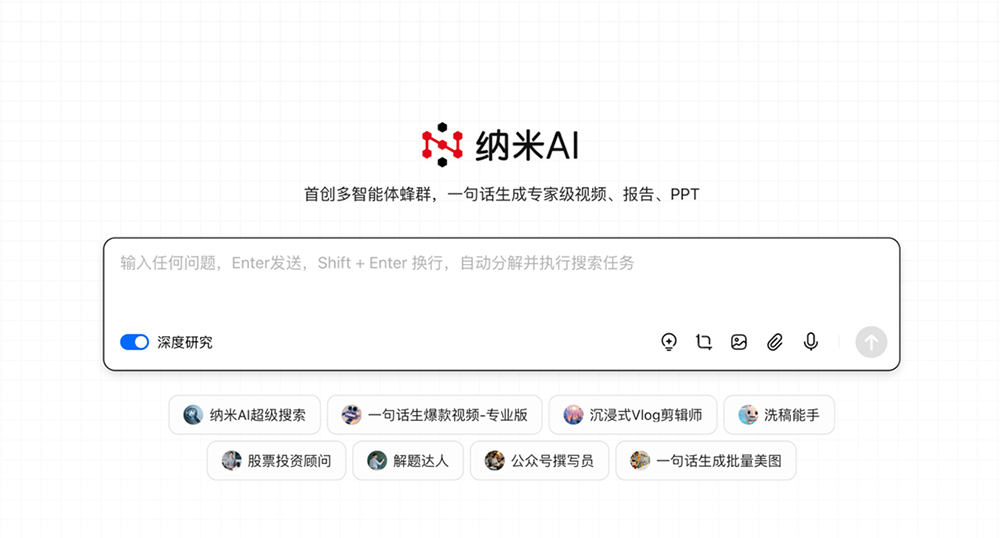 目前纳米AI已上线10+类多智能体蜂群,涵盖视频制作、内容创作、行业研究、电商带货、旅行规划等多个场景,这些多智能体蜂群由每个行业的业务专家主导定制,更懂你,更实用。